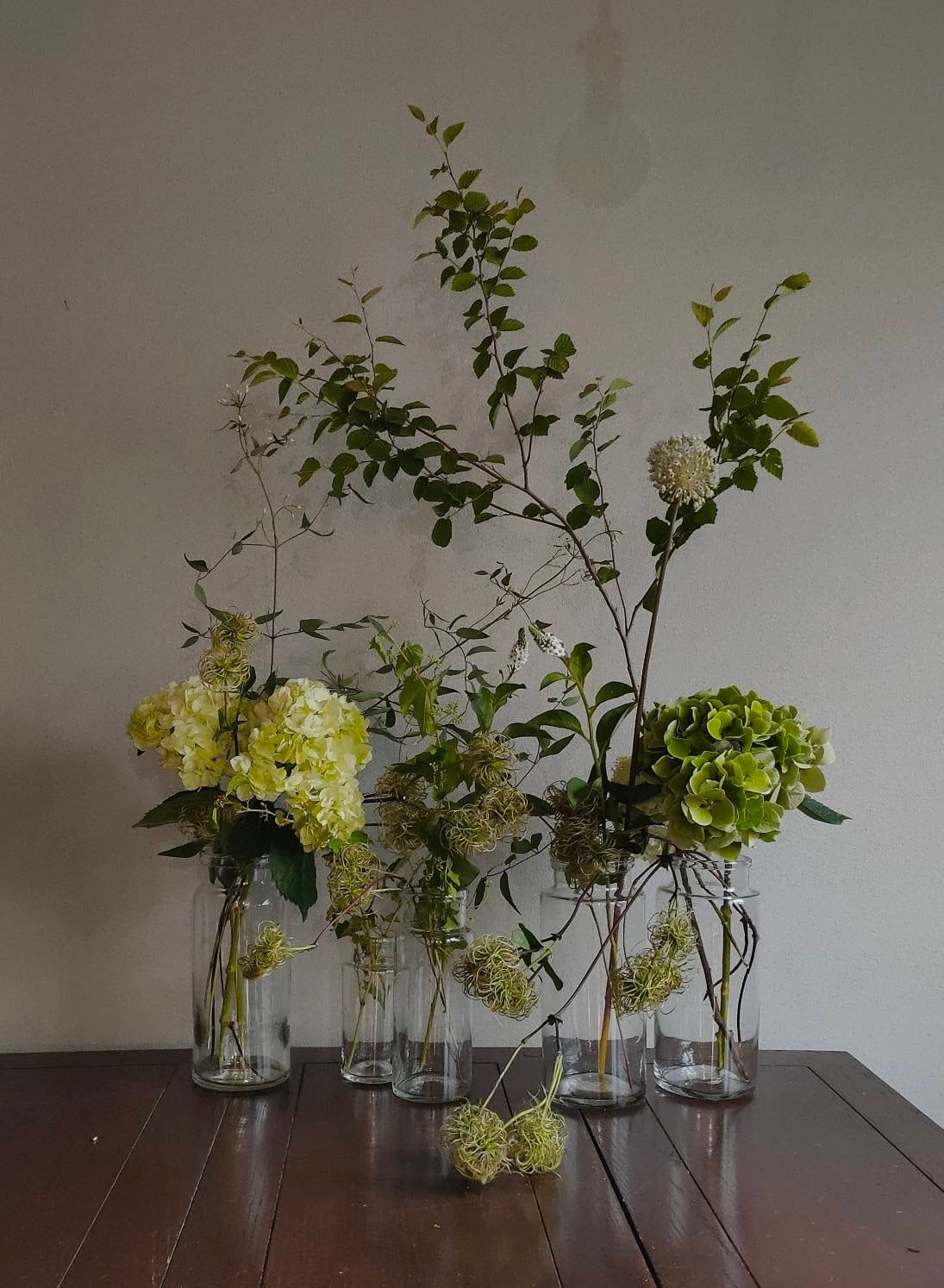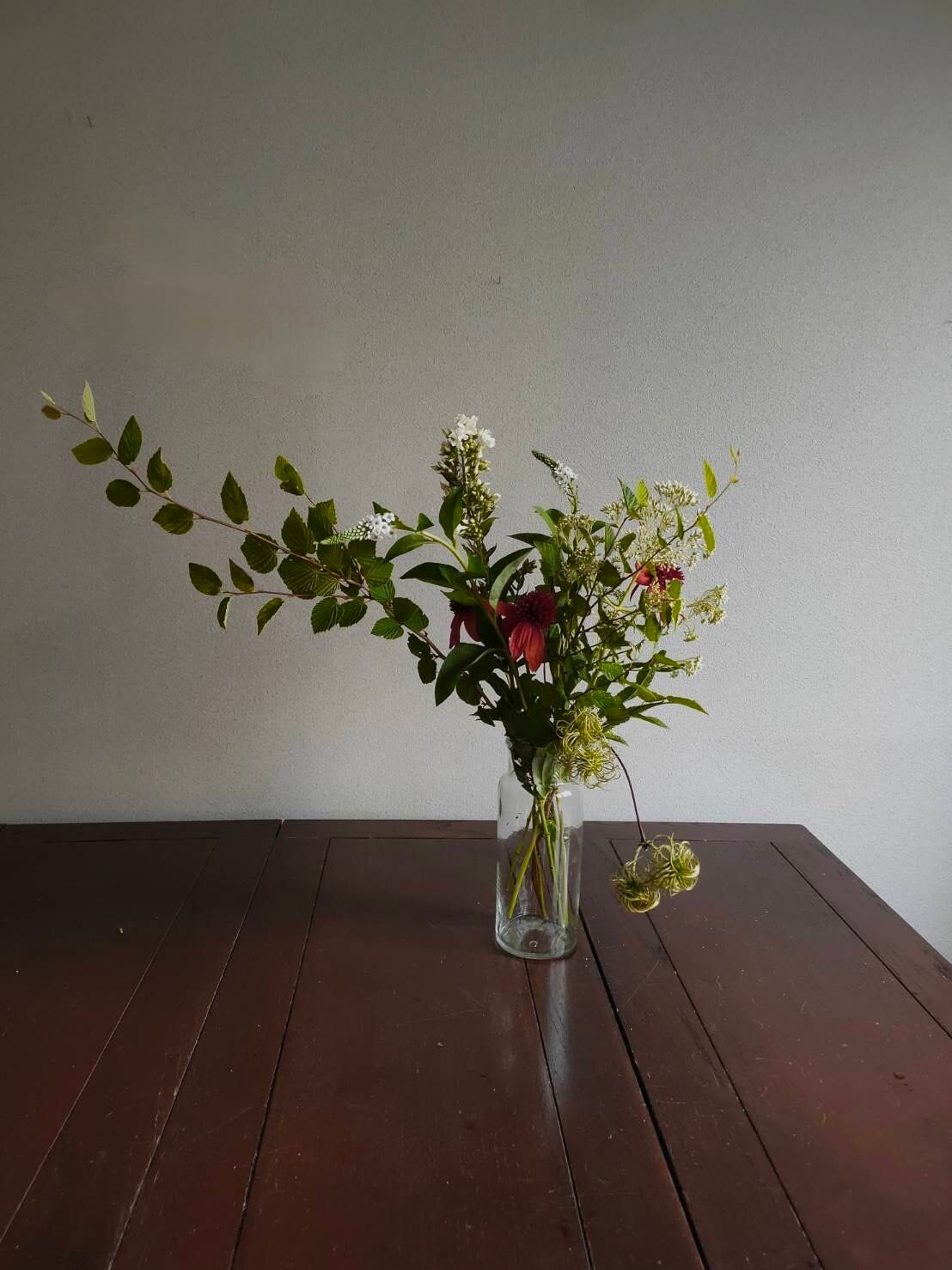 森や山から摘んできたようなナチュラルな花材で束ねたシンプルなブーケ付き